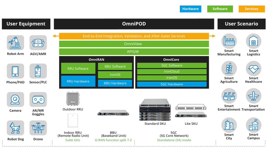 QCT OmniPOD is an end-to-end private 5G solution that unifies OmniCore (5G Core), OmniRAN (5G RAN), and OmniView (OAM system) into a turnkey package with fully integrated software, hardware, and services. The solution is built on a standalone (SA) architecture and complies with the 3GPP Release 16 standard. Designed in-house with best-of-breed expertise, OmniPOD empowers diverse cross-vertical wireless communication applications with advanced network reliability, efficiency, and manageability.