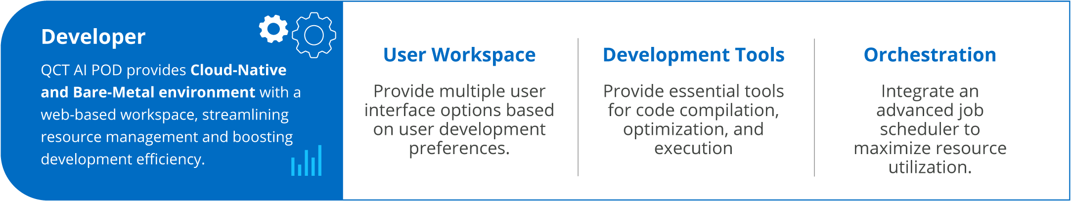 QCT AI POD is a software-defined solution tailored for cluster-scale architectures. Pre-integrated with hardware and software, it provides a scalable portfolio with built-in monitoring, management, and deployment tools, as well as a ready-to-use AI development environment. It simplifies cluster-level deployments and helps enterprises accelerate AI adoption.
